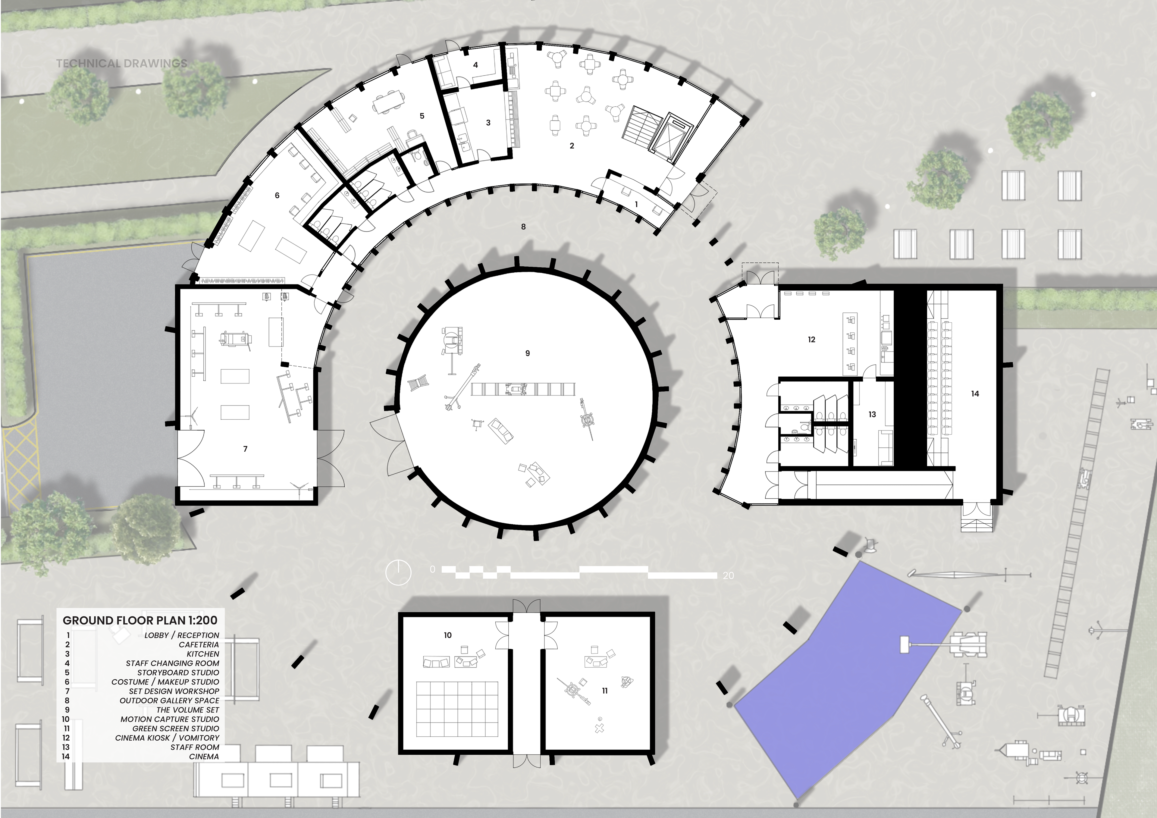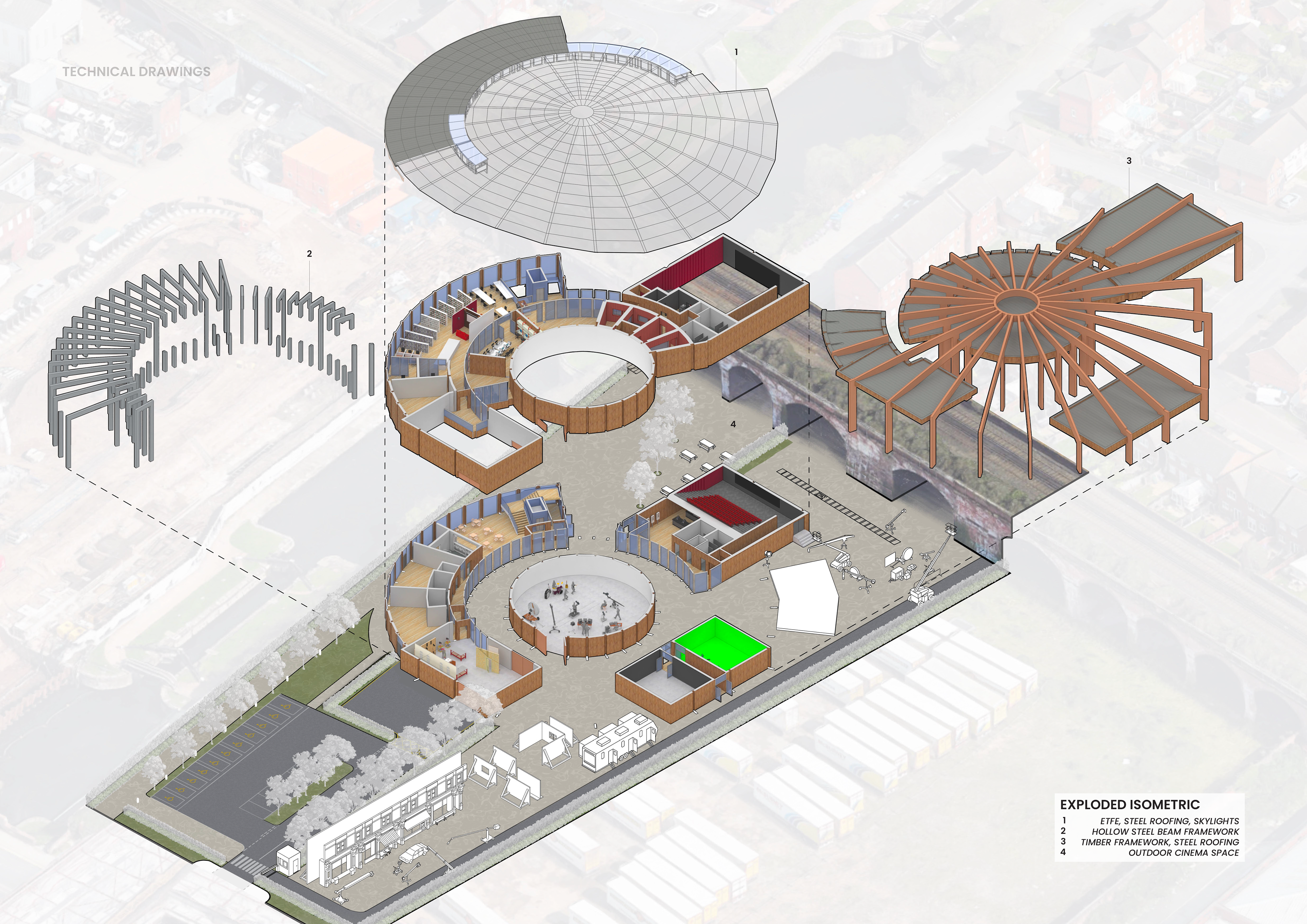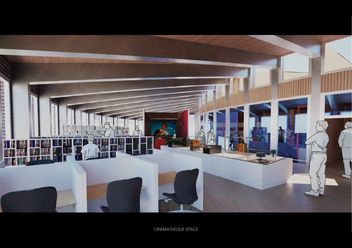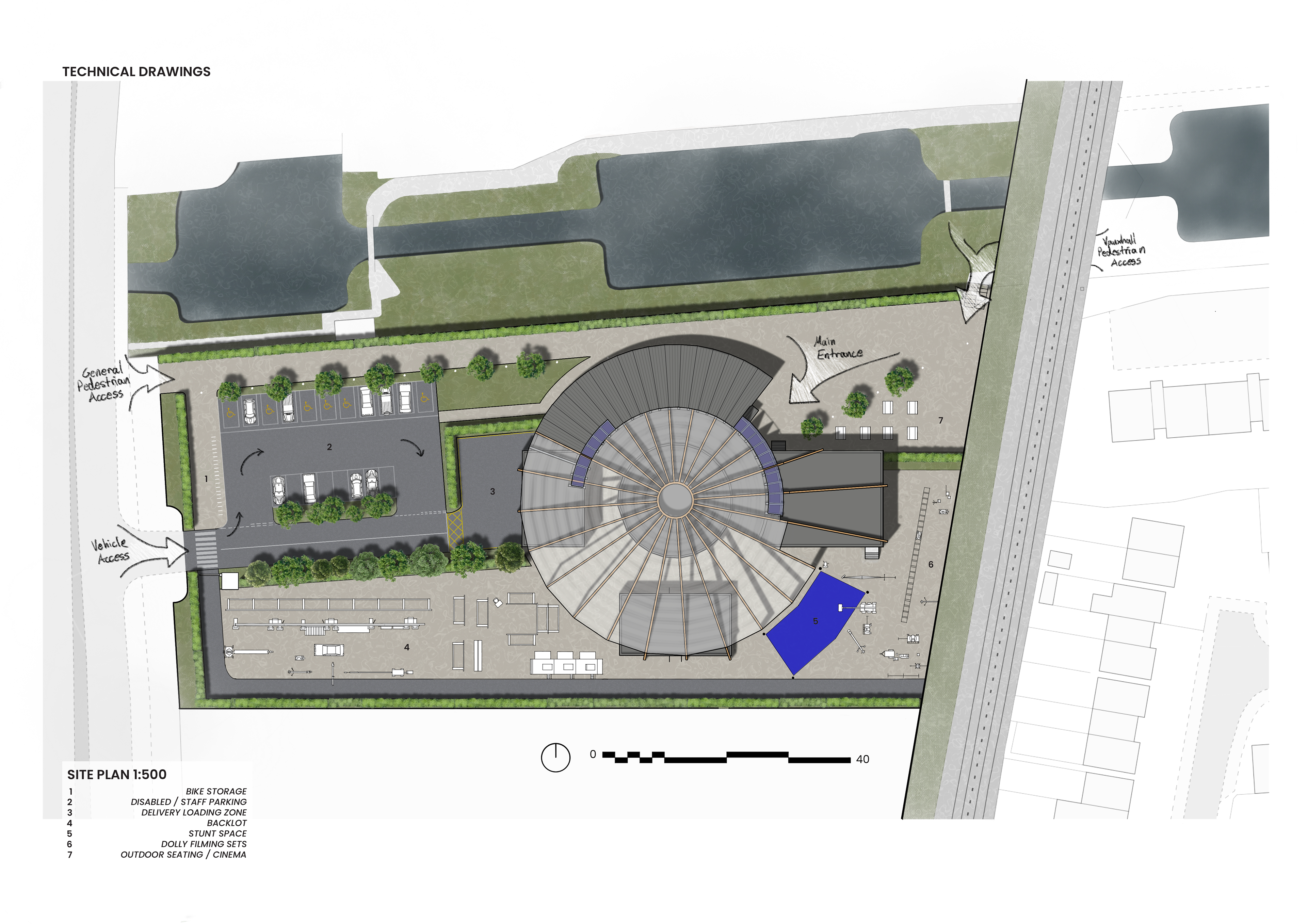 ‘Key Frames’ is a contemporary cinematheque and library in Liverpool that celebrates the city’s overlooked role in cinema while engaging the underrepresented youth of Vauxhall. Centred around a cutting-edge Volume set, the building’s cyclical layout guides visitors through every stage of filmmaking, from concept to distribution in an independent cinema. Thick timber beams evoke the provisional frameworks of film sets, while the industrial context of Stanley Dock is reimagined as cinematic backdrop. Blurring the boundaries between library and cinematheque, the project preserves film scripts, archives, and footage as educational resources for all.