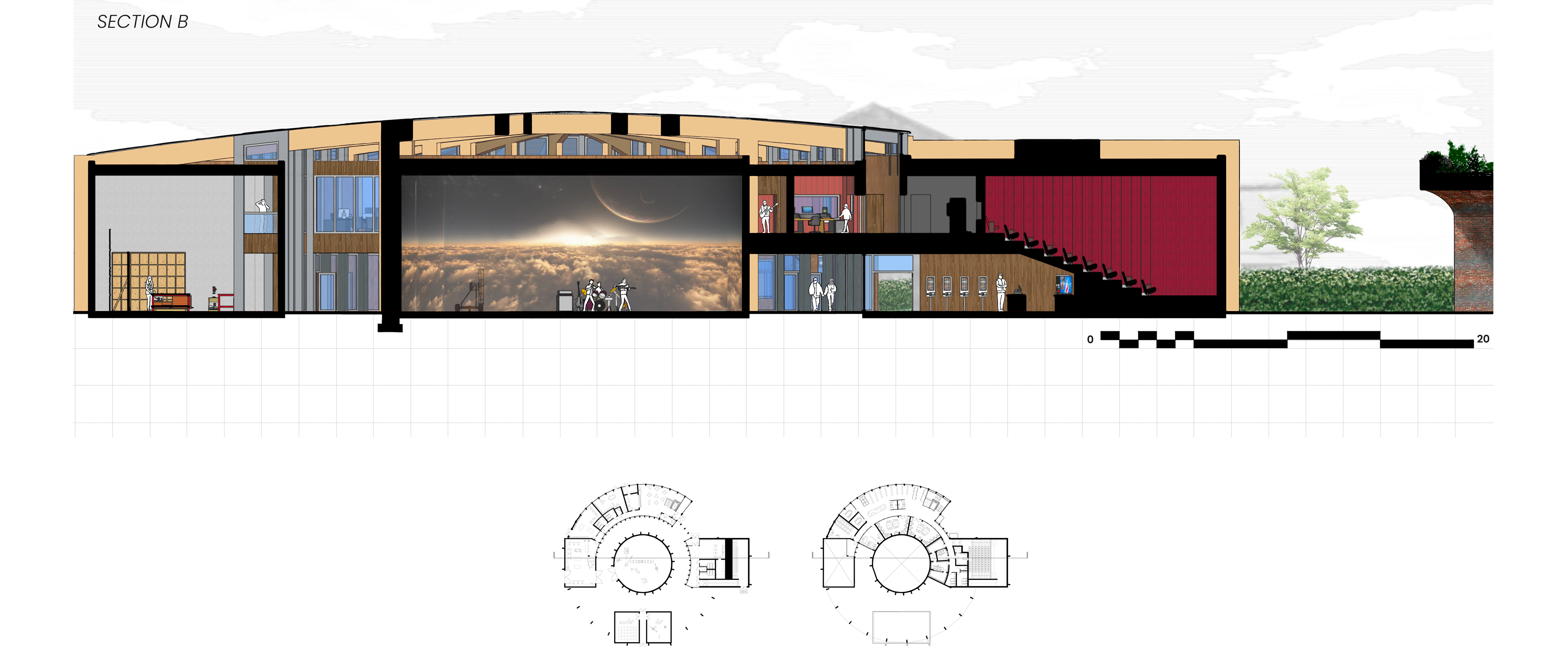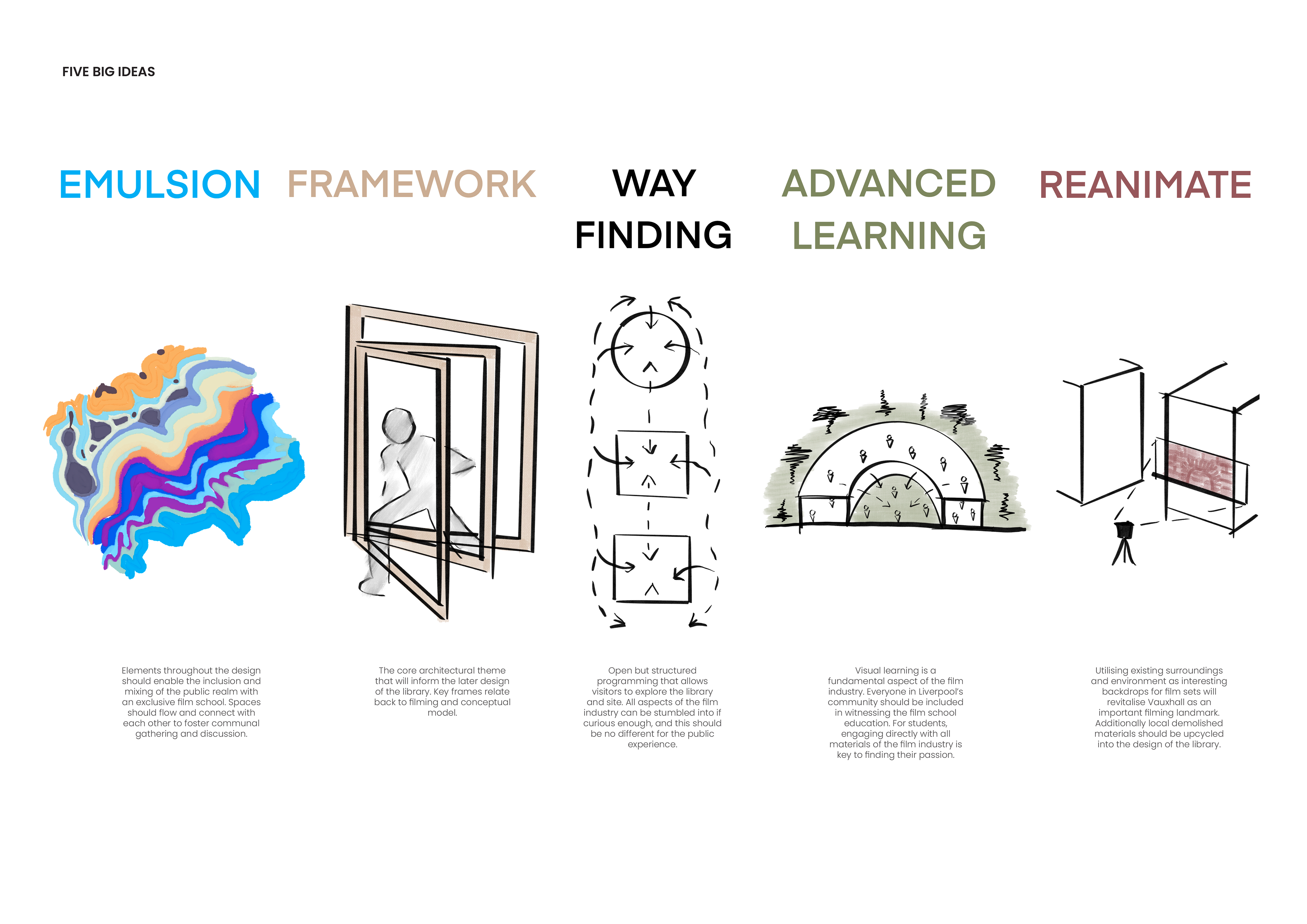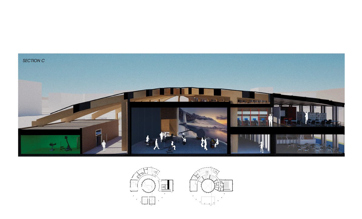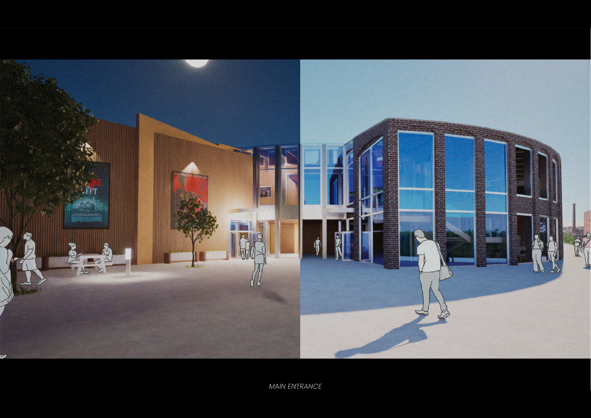 ‘Key Frames’ is a contemporary cinematheque and library in Liverpool that celebrates the city’s overlooked role in cinema while engaging the underrepresented youth of Vauxhall. Centred around a cutting-edge Volume set, the building’s cyclical layout guides visitors through every stage of filmmaking, from concept to distribution in an independent cinema. Thick timber beams evoke the provisional frameworks of film sets, while the industrial context of Stanley Dock is reimagined as cinematic backdrop. Blurring the boundaries between library and cinematheque, the project preserves film scripts, archives, and footage as educational resources for all.