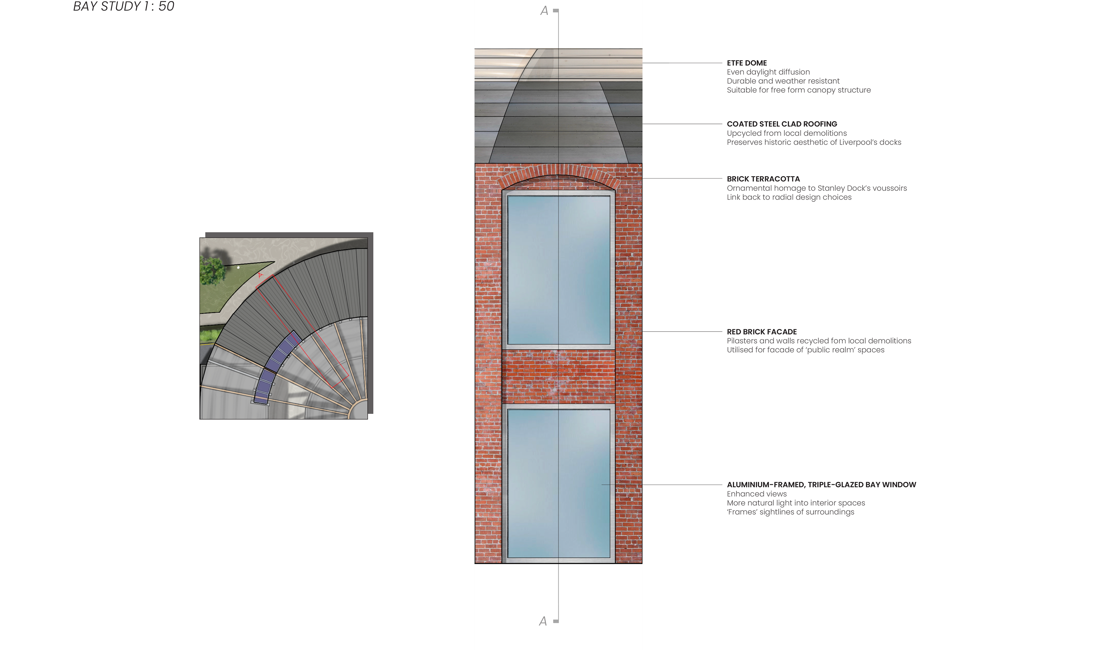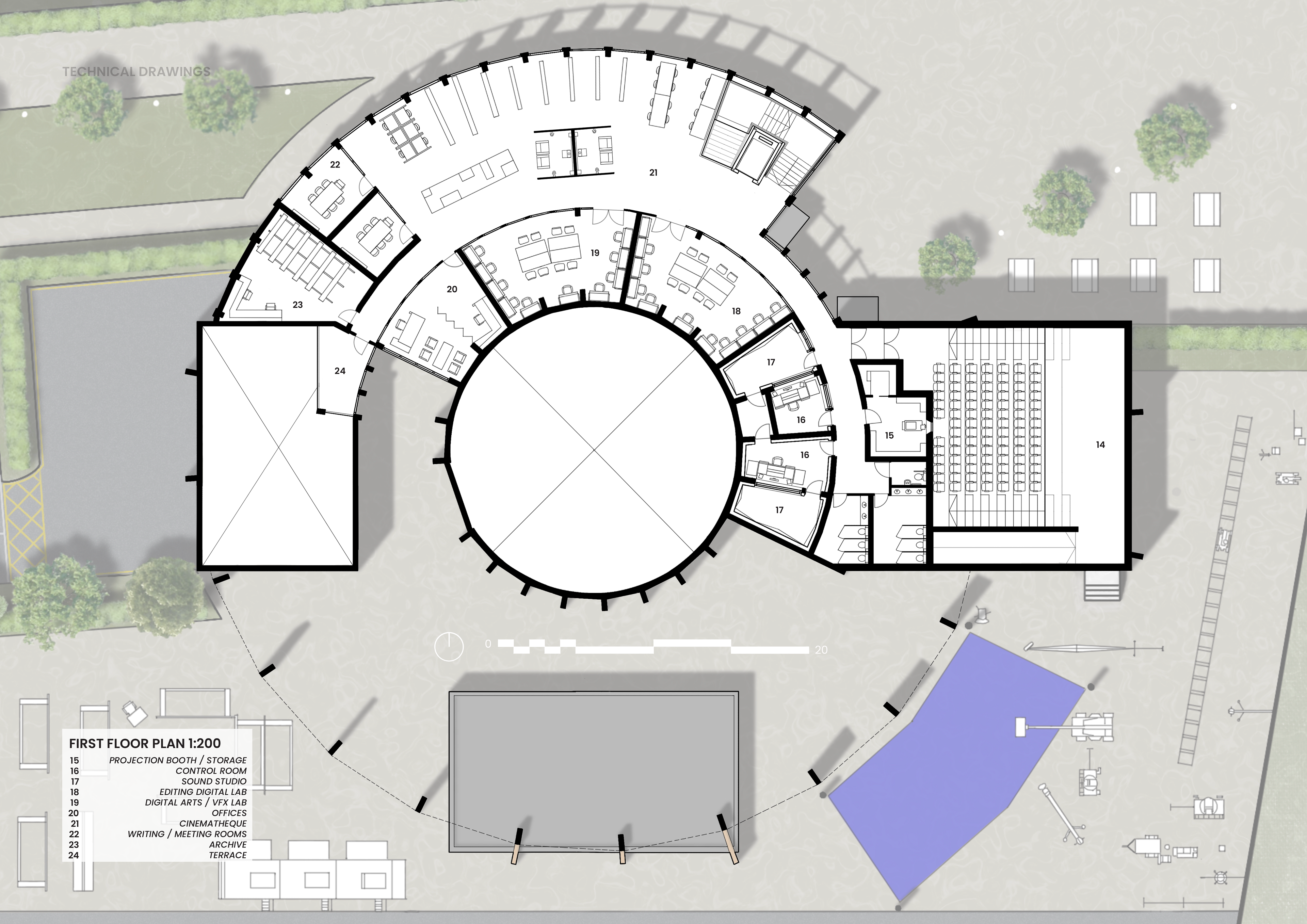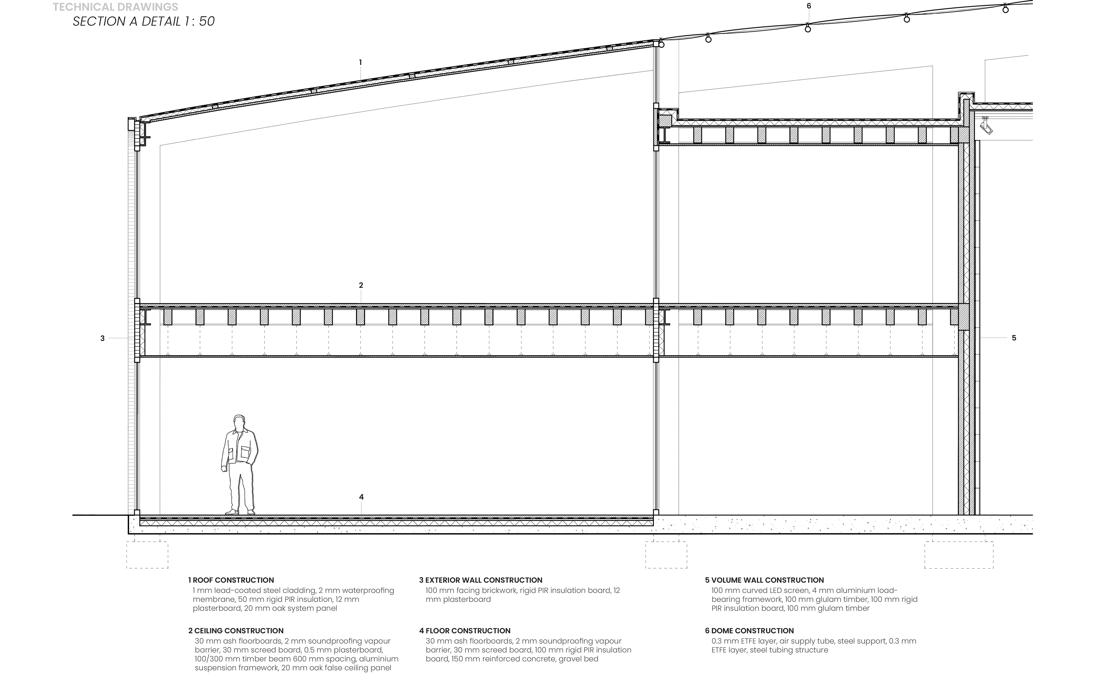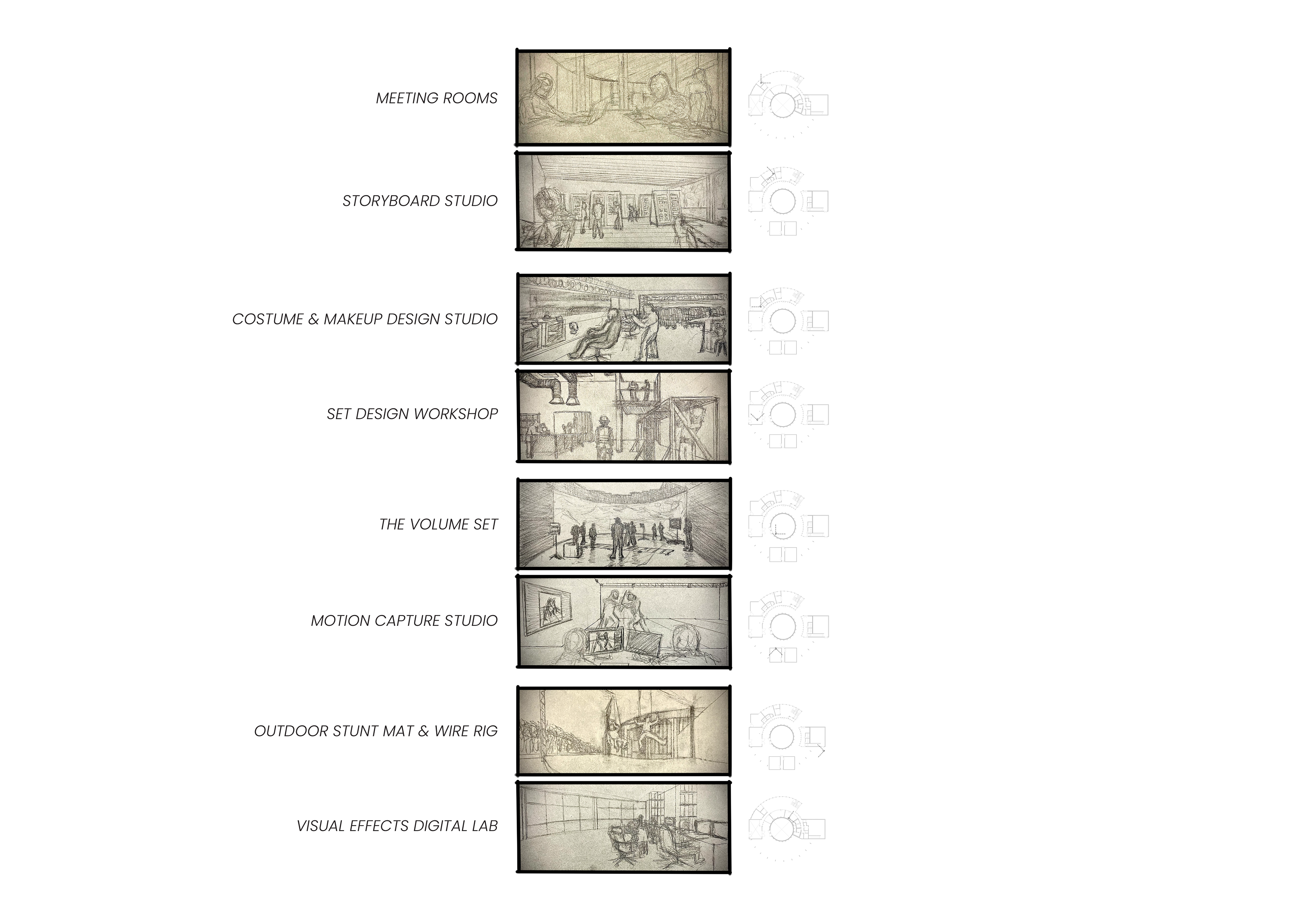 ‘Key Frames’ is a contemporary cinematheque and library in Liverpool that celebrates the city’s overlooked role in cinema while engaging the underrepresented youth of Vauxhall. Centred around a cutting-edge Volume set, the building’s cyclical layout guides visitors through every stage of filmmaking, from concept to distribution in an independent cinema. Thick timber beams evoke the provisional frameworks of film sets, while the industrial context of Stanley Dock is reimagined as cinematic backdrop. Blurring the boundaries between library and cinematheque, the project preserves film scripts, archives, and footage as educational resources for all.
