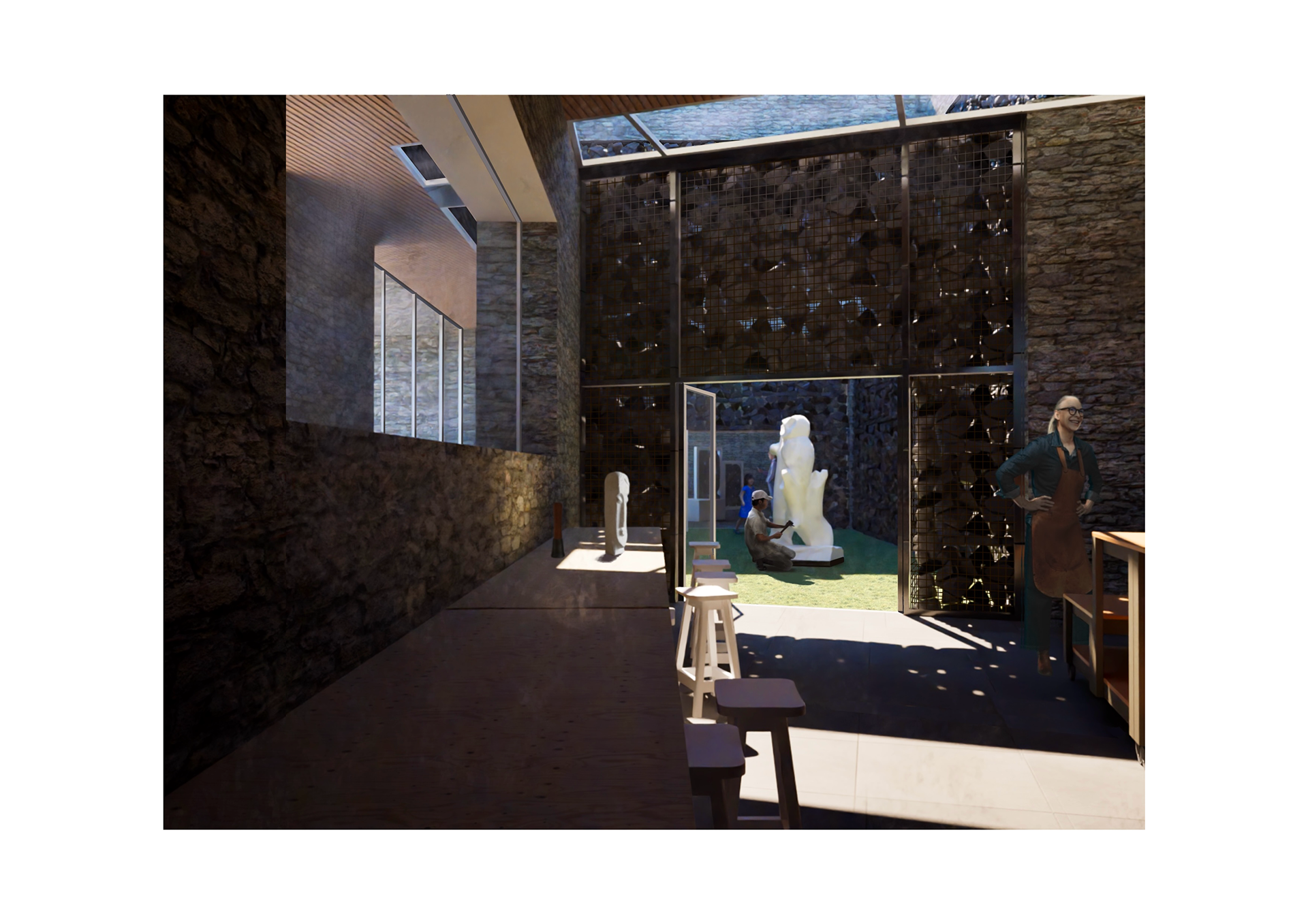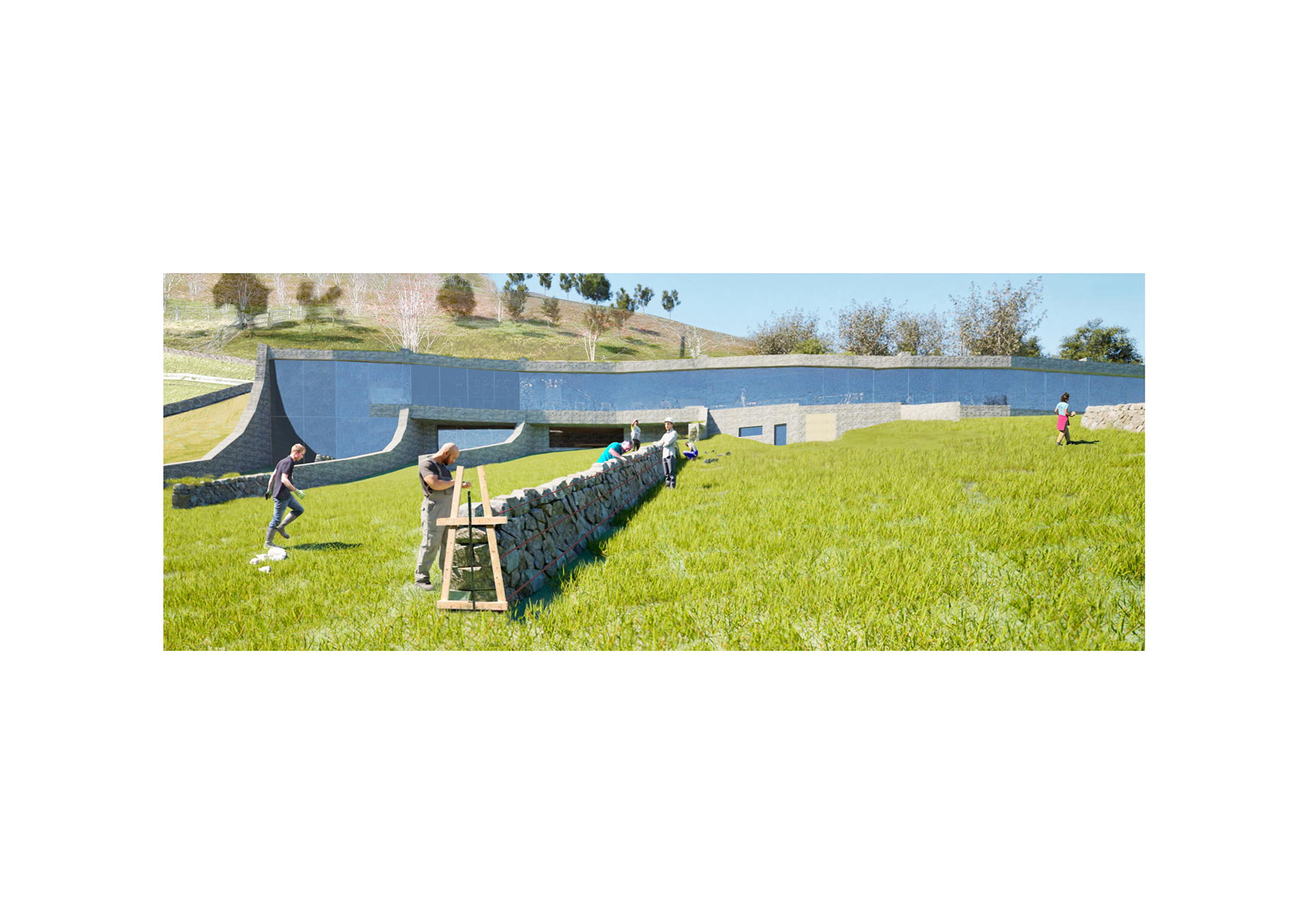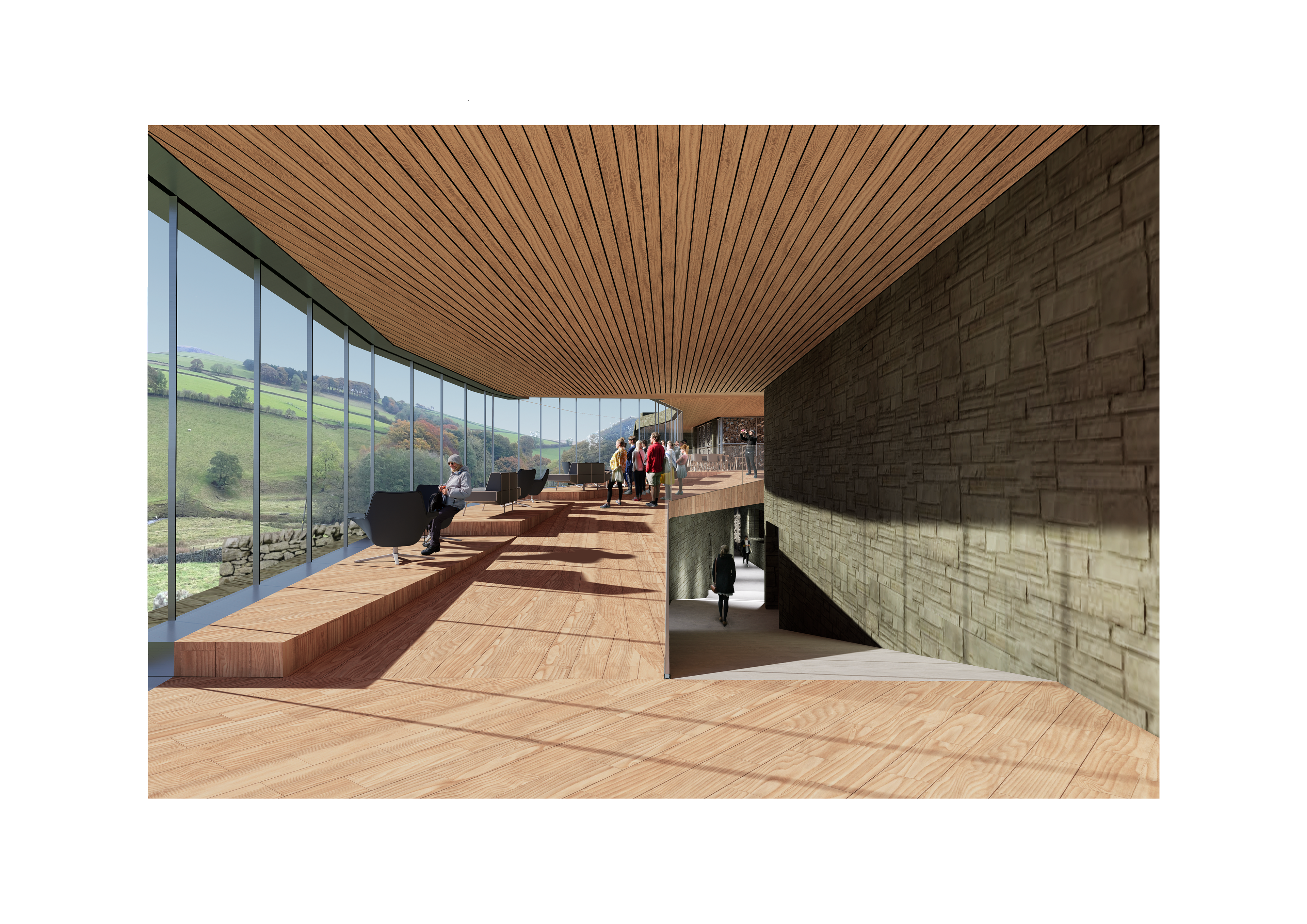 ‘Lithos’ is a local visitor centre project for Hayfield Village. Its design blends into the moorland landscape of the Dark Peak with a green roof and locally sourced sandstone walls. Prioritising low-carbon materiality, the design supports biodiversity, ecological monitoring, and the preservation of traditional crafts such as dry stone walling and stone carving. Spaces including a cafeteria, gallery, and lecture hall foster community engagement while offering views of Kinder Scout to enhance wellbeing.