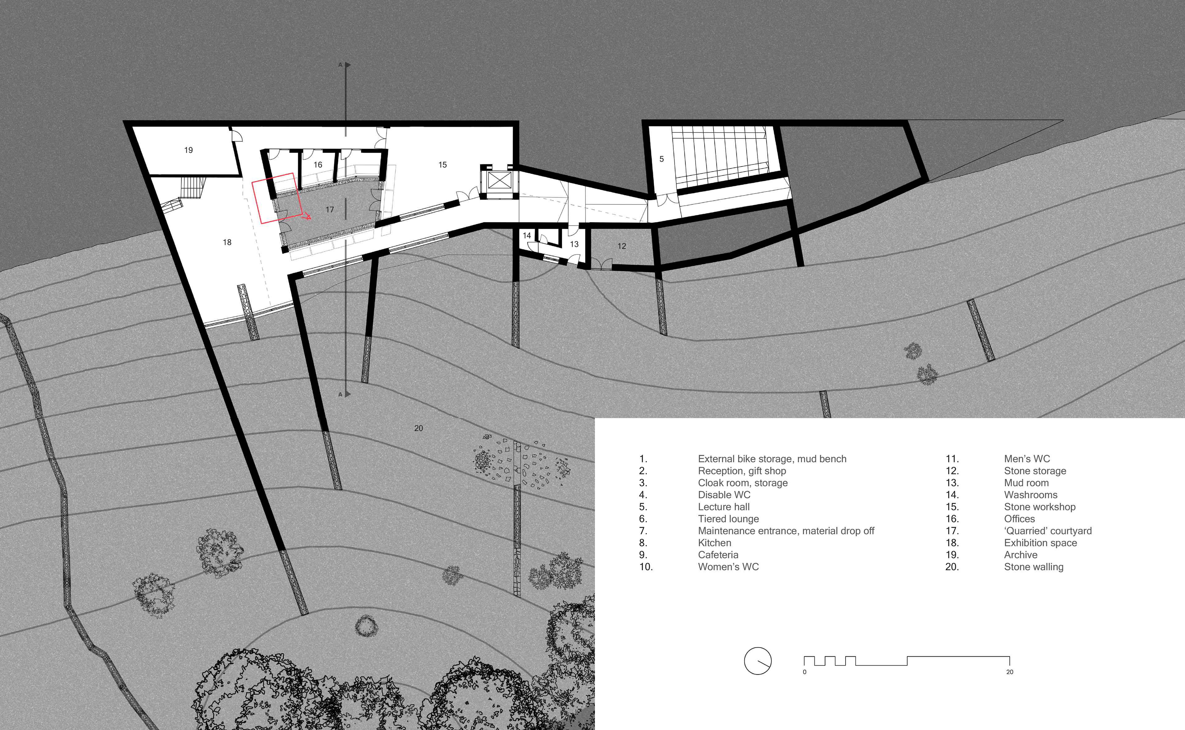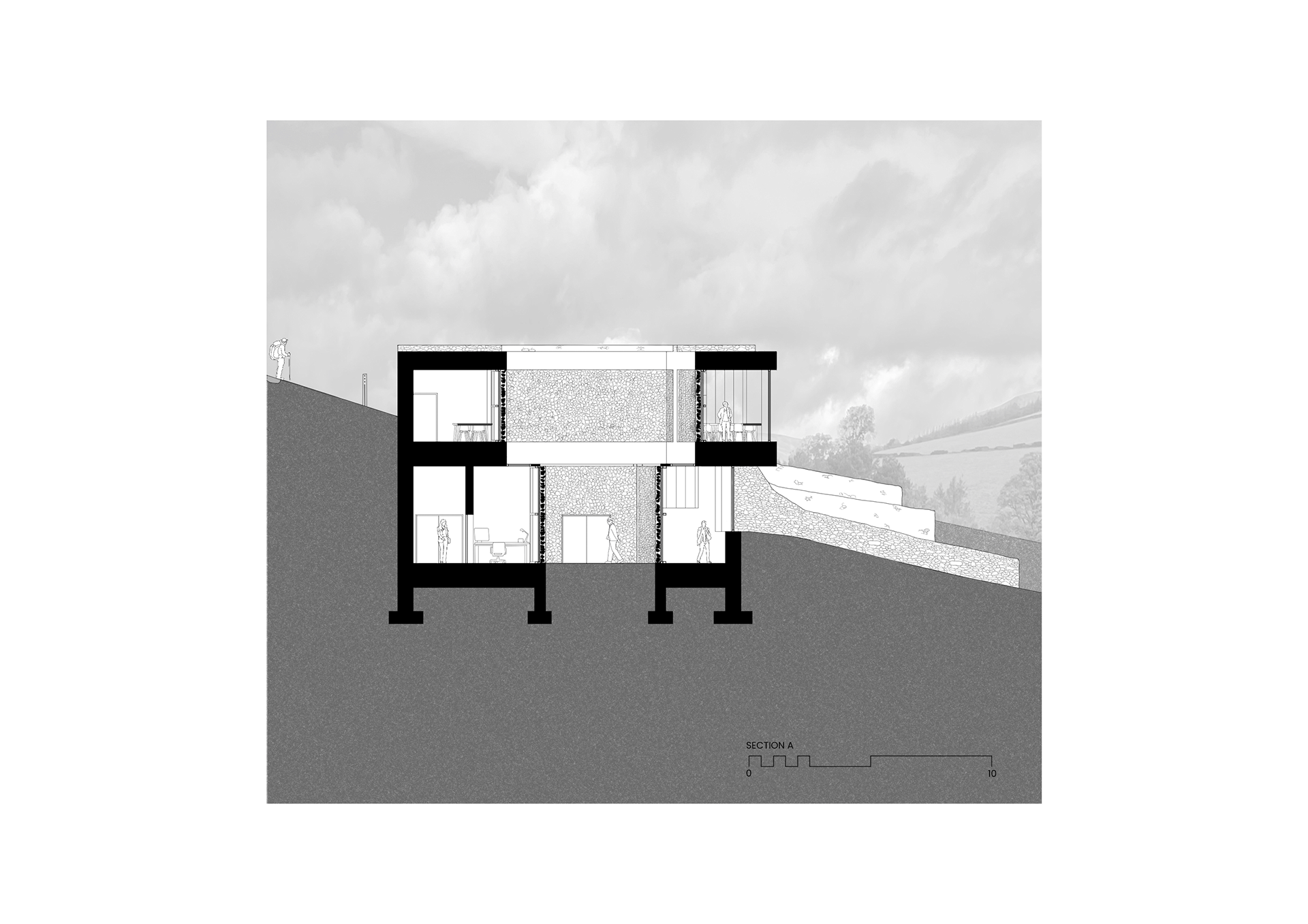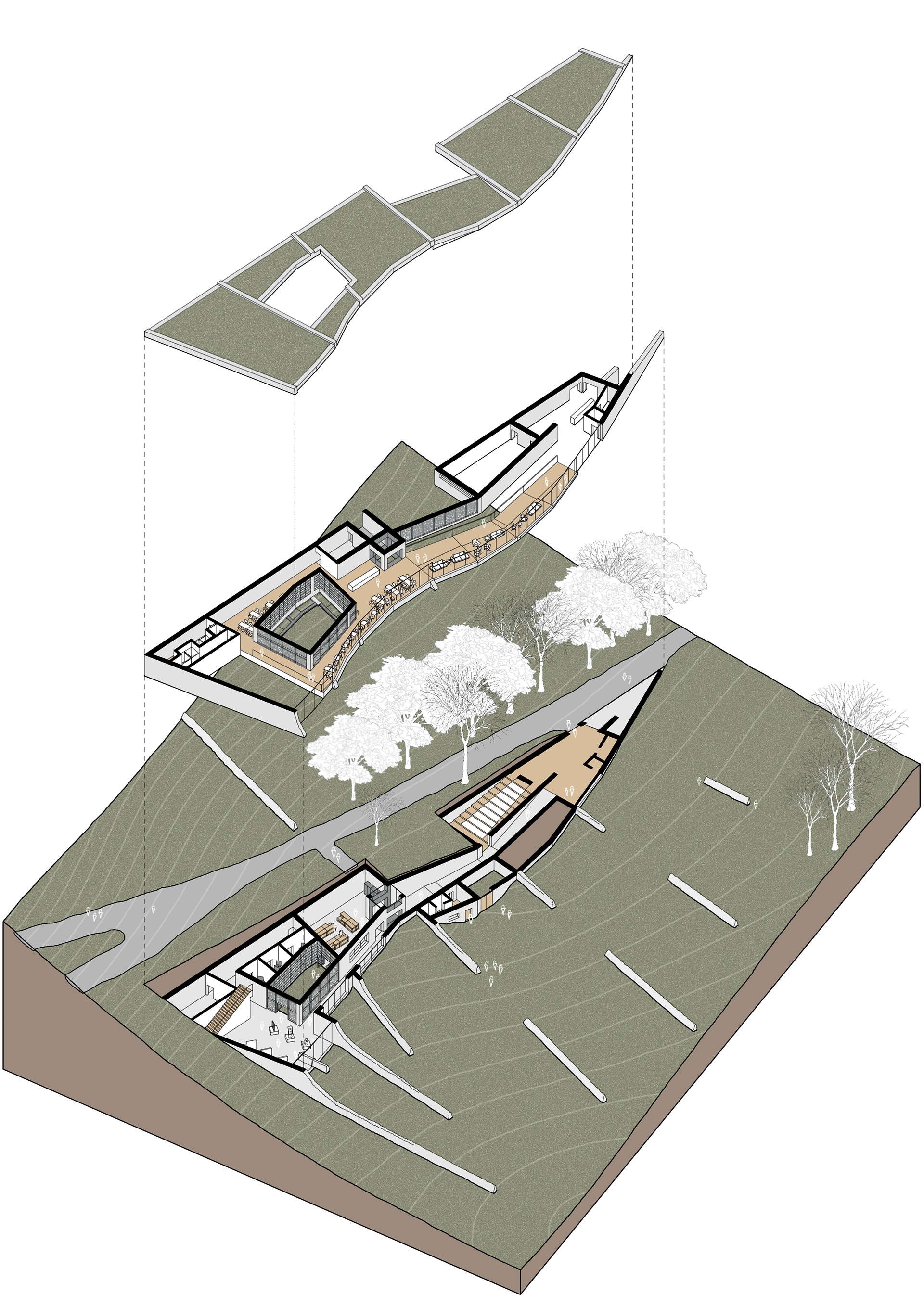 ‘Lithos’ is a local visitor centre project for Hayfield Village. Its design blends into the moorland landscape of the Dark Peak with a green roof and locally sourced sandstone walls. Prioritising low-carbon materiality, the design supports biodiversity, ecological monitoring, and the preservation of traditional crafts such as dry stone walling and stone carving. Spaces including a cafeteria, gallery, and lecture hall foster community engagement while offering views of Kinder Scout to enhance wellbeing.